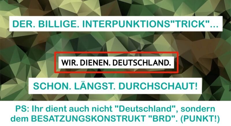 Fortgeschrittenes, sinnhaftes INTERPUNKTIEREN für BRD-Abiturienten und Insassen… (die NICHT im BRD-Fleischwolf landen wollen!) PS: Jeder Punkt schließt bedeutungsgemäß ab. Es sind demnach 3 voneinander UNABHÄNGIGE, in sich geschlossene Sätze… Man lässt es aber anders aussehen… »Deutschland« ist nämlich besetzt und zwar von der BRD… Wem Du dann wirklich „dienst“ (mit Gesundheit, Leib & Leben), kannst Du Dir jetzt sicherlich lebhaft vorstellen!… Weil ein echtes Deutschland verteidigt sich weder am Hindukusch, noch sonstwo…. sondern fängt erstmal bspw. damit an, seine zahlreichen … Weiterlesen “Wie die BRD die Leute veräppelt:”