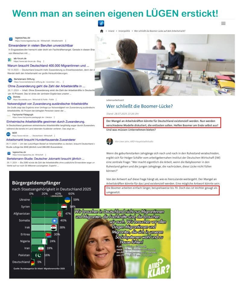 (an faustdicken Lügen und abgedroschenen Dauer-Phrasen!) Der EINZIGE, der im BRD-GULAG bis zum Ableben zur sprichwörtlichen Zwangsarbeit verpflichtet wird, ist der autochthone Deutsche… Wir wollen ja das versprochene „Wohlfühlprogramm“ in dem von uns finanzierten Sozialsystem nicht beeinträchtigen! PS: Als deutschsprechender Mensch verstehe ich den Begriff „Boomer“ nicht… Was haben solche denglischen Sprachverhunzer-Begrifflichkeiten bei der zwangsgebührenfinanzierten TAGES-SAU zu suchen?!…