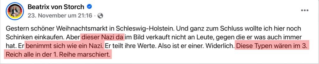 Da bleiben selbstredend keinerlei Zweifel mehr… → Die AFD (ebenso) als TODFEIND des Deutschen Volkes! (Ja, ich weiß… WIR wissen das ja schon länger!) Benutzen permanent antideutsche Diffamierungs-Begriffe! In dem konkreten Fall das vom Juden Konrad Heiden erfundene (Tot-) Schlagwort „NAZI“, was im Kern, bis zum heutigen Tag, den Inbegriff, für den Maximal- Ausbund an verklärenden, deutschenhass-triefenden JUDEN-LÜGEN steht! Seit Ende der 1920er Jahre wurde er permanent gegen uns verwendet, inkl. äusserst ausschweifend, weltweit medial ausgerollt, bei den Boykottaufrufen gegen uns 1933, die dann heute letztendlich genau gegenteilig, zu „völlig unmotivierten“, rein hasserfüllten Übergriffen gegen sie, geschichtlich umgedeutet wurden. (SiegerLügen auswendig lernen, heißt im Fachjargon ja auch: „Reeducation“, siehe auch Sefton Delmer, nachprüfber in jedem Klassenzimmer weltweit)… Nachtrag: Auch nicht zu vergessen → die Regenbogenfahne in ihrem Büro… (Die vorgeblichen „Patrioten“ und laienhaft gespielten „Vorkämpfer“ für Volk & Vaterland (lach!), sind eben auch alles andere als perfekt, was die Tarnung & Täuschung betrifft! Besonders in emotionalen Momenten, bspw. die besagte Weihnachtsmarkt-Geschichte, bricht der verinnerlichte Terminus ihres wahren AUFTRAGGEBERS durch… Dann leidet auch das rationale Denken vom Herrn Storch ein wenig) Fazit: Auf irrational-selbstbezichtigende Diffamierungs-Vokabeln, sogar noch aus dem jüdischen Fantasialand-Baukasten, steht eben kein aufgeklärter Deutscher!