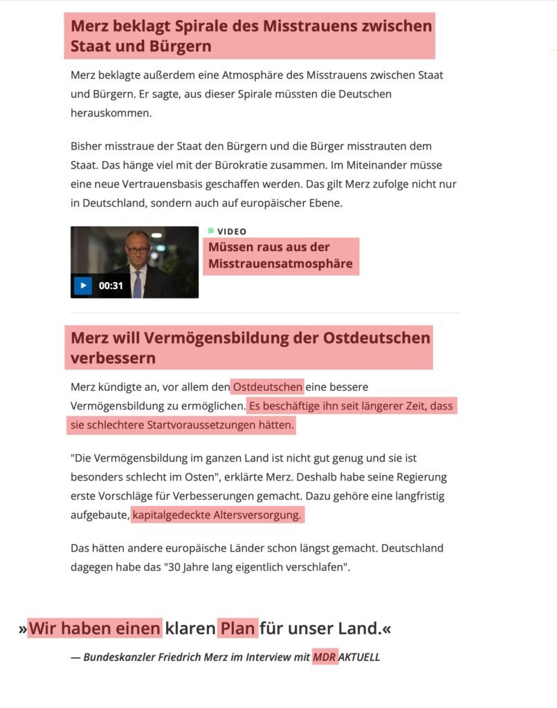 Und dann faselt der noch was von „Vermögensbildung“ der «Ostdeutschen»… (Doppel-Lacher!) Das sind korrekterweise MITTELDEUTSCHE, so wie der gleichnamige Rundfunk! Die BRiD-Lagerverwaltung hat in den letzten 35 Jahren mehr gespalten, als geeint und dann wundert DER sich über Ablehnung! Stichwort → Lohngefälle und wirtschaftliche Aussichten, Millionen mussten abwandern, wenn sie nicht verarmen wollten! PS: Es möchte eben nicht Jeder in der «Kriegs-Wirtschaft» arbeiten, als USA 2.0… Kriege, Kriege, Kriege… Wie war das nochmal mit den 50 einflussreichsten «Na-Ihr-wisst-schon»?!… → Sperre die weg und SÄMTLICHE Kriege weltweit enden sofort… Toller erwartbarer «Trick», findet ihr nicht?!… Nachtrag: Der Blackrock-Vertreter Merz will den MITTEL-Deutschen (nach dem «Erfolgsmodell der ober-genialen» Schweine-(P)riester-Rente), eine kapitalgedeckte Altersversorgung andrehen… Das dürfte dann real heißen → Arbeiten bis zu letzten Atemzug, da das einzige «Kapital», was die geprell(-meisterten)ten zu sehen bekommen werden, der TOTALVERLUST sein wird… Das besagte Kapital wurde nämlich zwischenzeitlich zu den Merz-Cliquen-Kumpels umgeschichtet… TIP: Halte Dich von solchen windigen Gestalten und ihren «Versprechungen» fern!