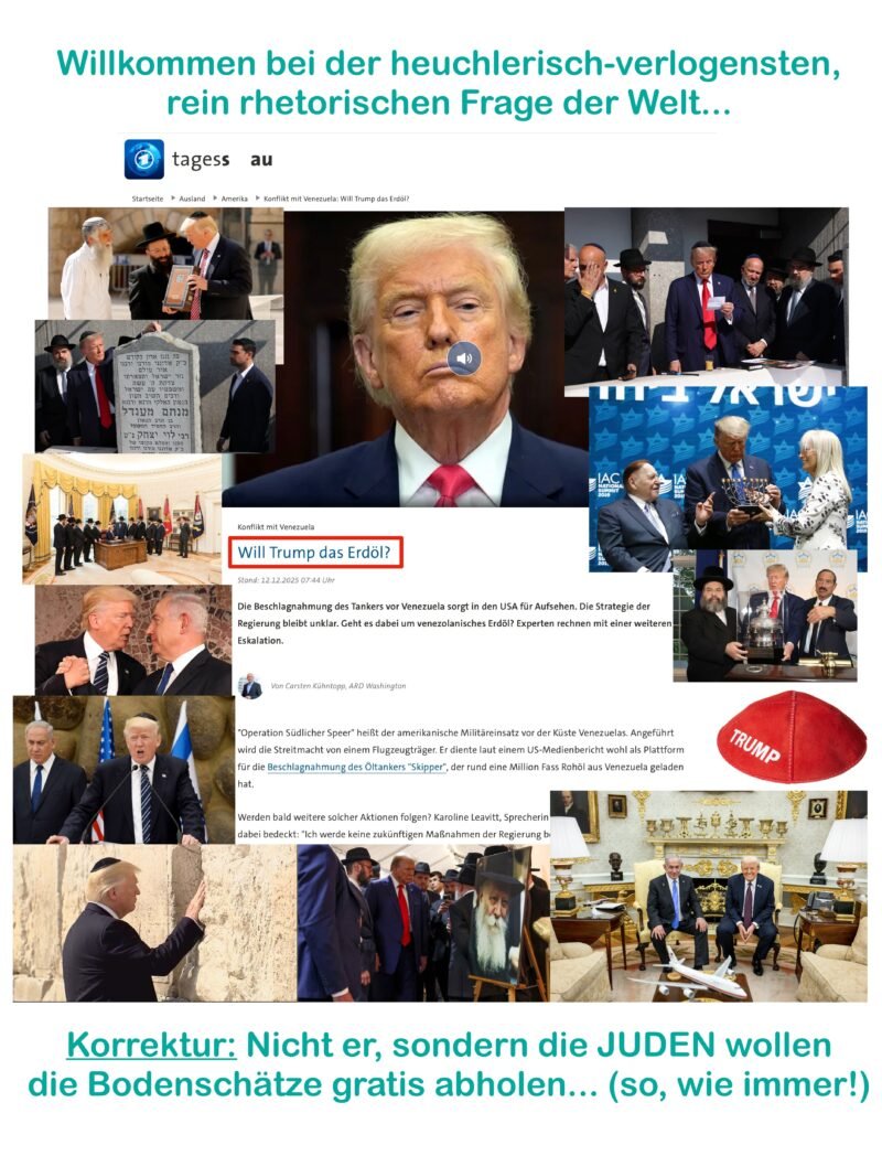 PS: Anbei zu dem TAGES-SAU-Artikel habe ich mal vom Torah-gekrönten TRUMPel die schönsten Fotos aus seinem Poesiealbum beigefügt… Von Epsteins komprittierender Kinder-Fick-Insel habe ich leider auf die Schnelle (noch) nichts gefunden… Ist auch unwahrscheinlich, so zielstrebig, wie er sich für JUDA ins Zeug legt…Nachtrag: Alleine die Überschrift der Desinfo-Sudel-Schreiberlinge schon: „Konflikt“ mit Venezuela… Venezuela hat niemanden etwas getan, sie besitzen bloß zuviel Öl, was gewisse Herrschaften, mit massig Profitinteresse, aber dafür null Einkaufspreis, höchst berechenbar & zuverlässig auf den Plan ruft… Diese groteske „Friedensnobelpreisträgerin“, angeblich aus Venezuela, ist ja alleine schon ein Indiz, wer wieder einmal mehr, hinter dem ganzen Zirkus steckt… Aber die Umsturzversuche laufen ja schon seit zig Jahrzehnten, bloß damals dachte ich auch noch, „Amerika“, sei einfach nur kriegslüstern und gierig, bis man endlich begriffen hat, wer sich hinter der Landesbezeichnung, oder eher Sockenpuppe „Amerika“, als Stiefelknecht und Beschaffungskrimineller, in Wahrheit versteckt… Auch ist die fremdbestimmte BRiD ganz sicher nicht ein souveränes „Deutschland“, das erklärt im Grunde schon alles, gut erkennbar, regelrecht schier am Rande des Wahnsinns, was im Lande so vor sich geht… Wer naiv und einfältig, heutzutage immer noch glaubt, hier und dort „versagt“ die „Politik“, oder gar der vermeintliche „Staat“, der sollte sich mal eingehend neurologisch untersuchen lassen!…